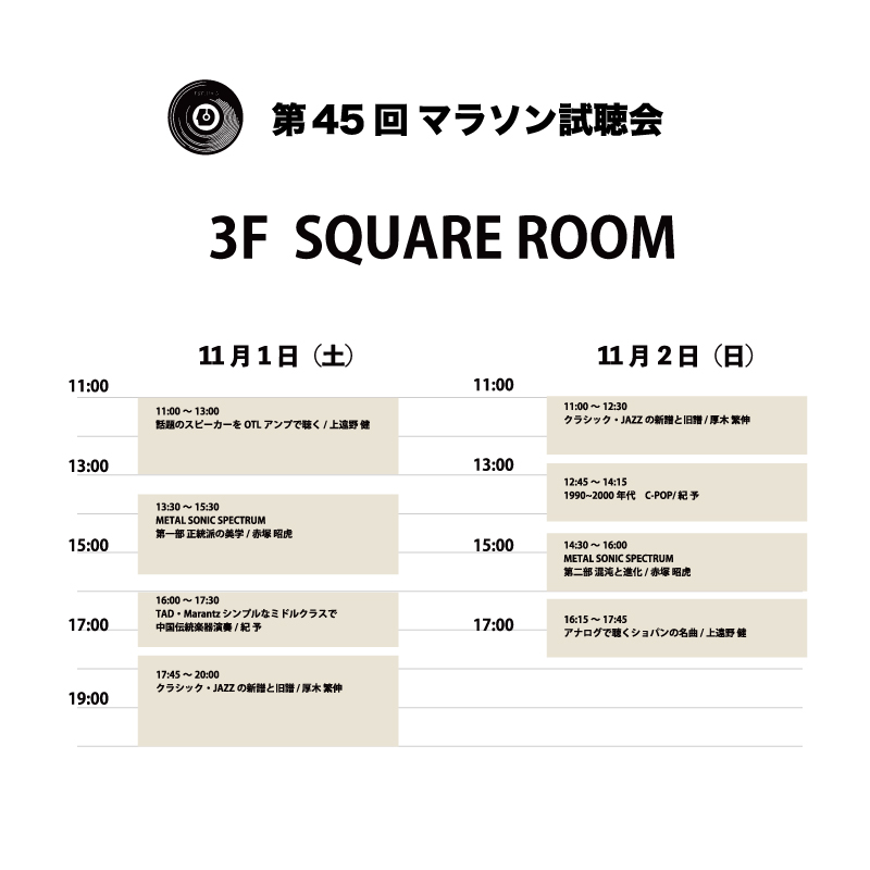 今年のマラソン試聴会は創立60周年ということで過去最大の規模、新たに加わった3階スクエアルームはメインステージに次ぐ広さがあります。ここでは「4人のスタイル、8つの試み」と題しまして4名のスタッフが工夫を凝らしたシステム提案と音楽再生を行います。どちらかというと機器の聞き比べより音楽を聴かせる方に重きを置いたプログラムが多くなっております。時間の許す限りお楽しみ下さい。
